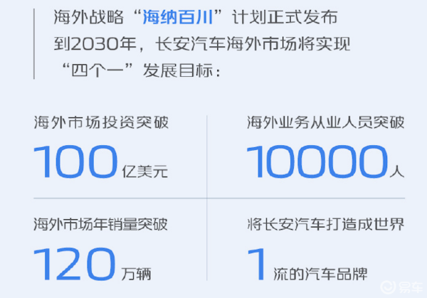 其计划到2030年,长安汽车海外市场将实现“四个一”的发展目标:即海外市场投资突破100亿美元,海外市场年销量突破120万辆,海外业务从业人员突破10000人,将长安汽车打造成世界一流的汽车品牌。