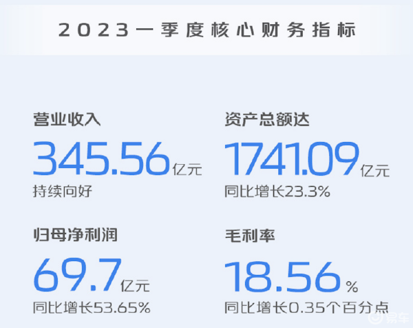 2023年一季度,长安汽车实现营业收入345.56亿元,同环比基本保持稳定;归母净利润69.7亿元,同比增长53.65%;扣非归母净利润约14.81亿元,同比降低34.75%;资产总额达1741.09亿元,同比增长19.21%。良好的发展势能持续且稳定,净利润大幅增长。