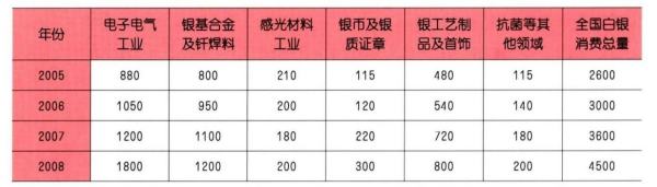 中国白银应用领域普遍出现增长态势,2008年较2007年增长25%。2008年白银的消费结构为:电子电气工业40%,银基合金及钎焊料27%,感光材料工业4%,银币及银质证章7%,银工艺制品及首饰18%,抗菌等其他领域4%。