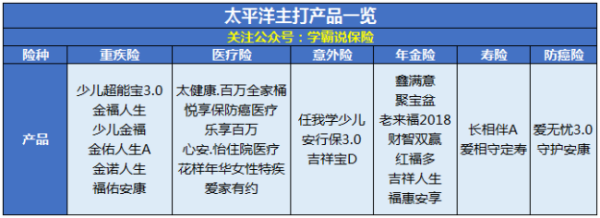 太平洋人寿经营的几大险种为健康险、意外险、寿险、年金险等。我把太平洋人寿的一些主推产品,整理在了下表,大家可以看看: