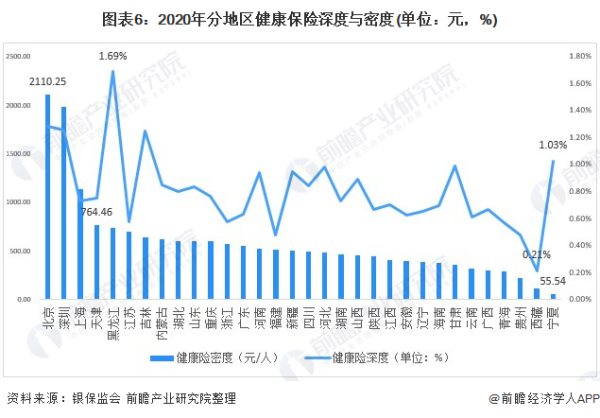 ——健康险深度密度:北京保险深度最高,黑龙江保险密度最高