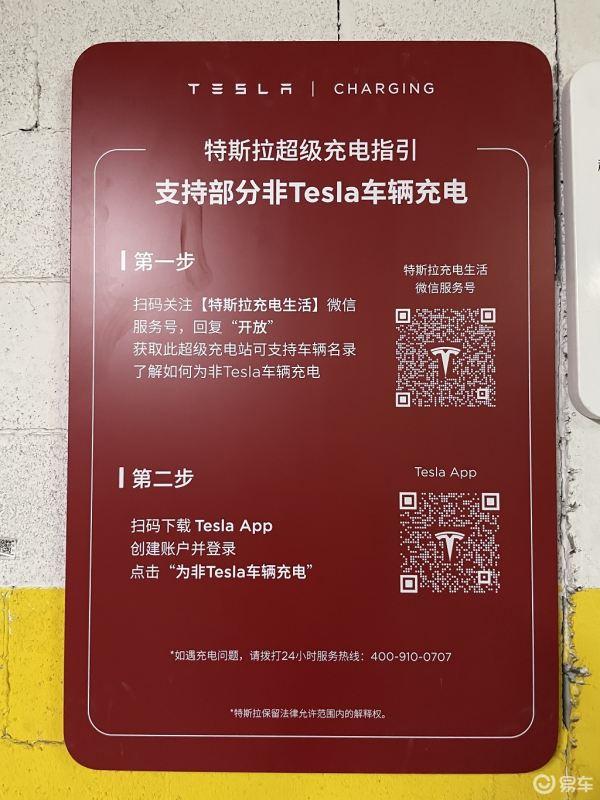在这座充电站一侧的墙壁上,看到了一个比较显眼的红色牌子上标注了特斯拉超级充电指引,并且提到了“支持部分非特斯拉车辆充电”。在现场我们共看到了两辆特斯拉车型在此充电,但是并没有看到非特斯拉车型停靠于此在此补能。