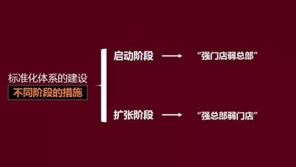 标准化体系的建设,我们常常说分总部和门店的标准化,什么时候建设门店的标准化?什么时候建设总部的标准化?这都是需要看连锁企业的阶段。