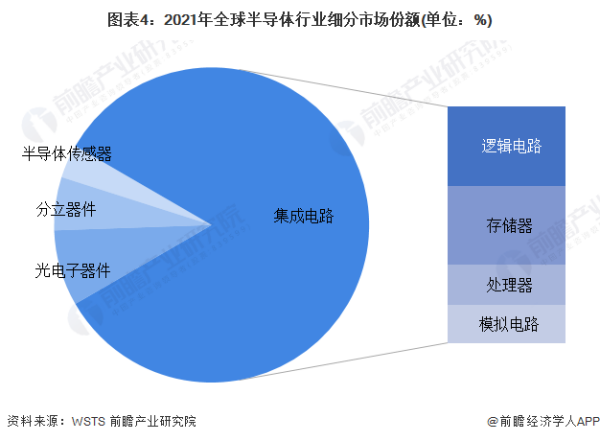 从半导体细分领域来看,集成电路一直是半导体行业的主要细分领域。2021年,集成电路市场规模达到4630.02亿美元,同比增长28.2%,占全球半导体市场规模的83.29%。其中,集成电路又可细分为逻辑电路、存储器、处理器和模拟电路,2021年这四个产品占比分别为27.85%、27.67%、14.43%、13.33%。2021年存储器、模拟电路和逻辑电路都实现较大的增长。
