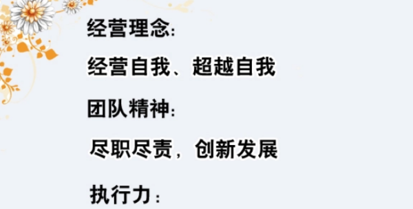公司经营理念是管理者追求企业绩效的根据,是顾客、竞争者以及职工价值观与正确经营行为的确认,然后在此基础上形成企业基本设想与科技优势、发展方向、共同信念和企业追求的经营目标。