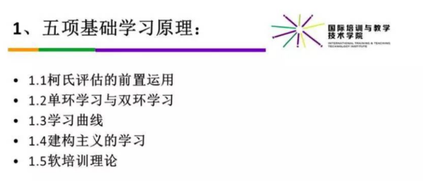 3、围绕培训目标设计学习过程,其中要考虑到单环学习和双环学习,考虑到学习曲线,考虑到建构主义的学习方法应用,以及硬培训和软培训分不同的方式来进行学习和考核;
