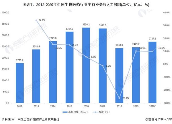 根据工业和信息部发布的数据,2019年我国规模以上生物医药企业实现主营业务收入2479.2亿元,同比上升10.3%。前瞻保守估计2020年我国规模以上生物医药企业实现主营业务收入约为2727.1亿元。