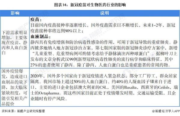 从血液制品领域来看,血液制品是我国生物医药行业的细分产品,直接影响着生物医药行业市场前景。2020年,受疫情推动血制品领域重回景气上升期。疫情促进血制品企业2020年提速增长,部分产品存在提价可能性。国内外新冠疫情爆发,对血液制品行业的影响主要体现在两方面。