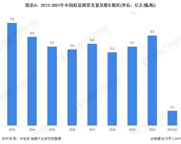 2020年疫苗合计批签发6.5亿支,同比增长15.89%,增速为近十年来最高,疫情影响逐渐减弱后,随着疫苗接种需求的复苏,疫苗批签发呈现上升趋势。2021年第一季度,中检所共批签发1.12亿支/瓶/粒/盒疫苗,同比下降14.01%。