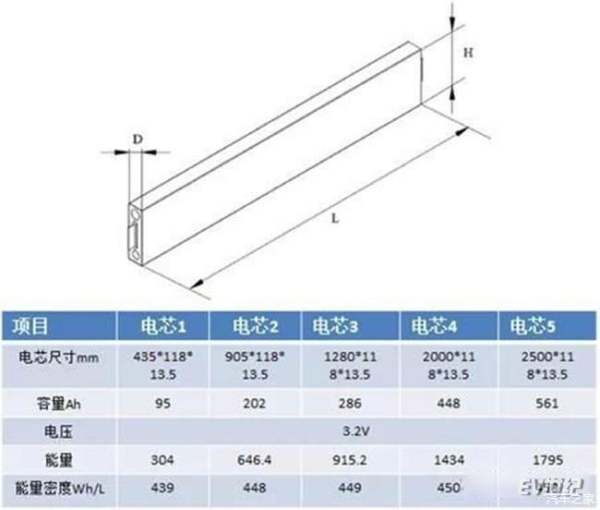 通过尺寸数据可以看到,刀片电池的高度和厚度是固定的,高度为118mm,厚度13.5mm。主要是长度部分,刀片电池从435mm到2500mm有多种规格。