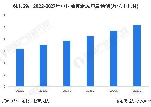 随着新能源装机量的稳步增长,预计至2027年我国光伏、风能、水能、火电等新能源发电量也将随之进一步高增,前瞻根据近年来我国新能源发电量以及新能源行业发展趋势初步预测至2025年末,我国新能源发电量可达到4.28万亿千瓦时,至2027年末,新能源发电量或将突破5.20万亿千瓦时。