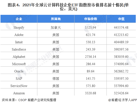 美国云计算产品与技术成熟度较高。从全球云计算科技企业的ETF指数来看,按市值排名前十企业中除SAP和Shopify以外均为美国企业,其中Adobe、Intuit、Salesforce市值分别达41.22万美元、40.45万美元、39.04万美元,说明美国企业云计算相关技术较为领先。