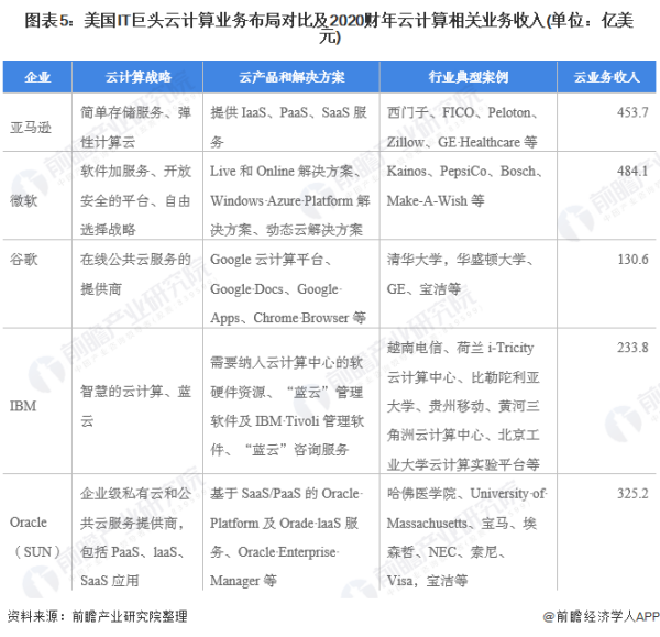 从美国云计算企业布局情况来看,美国重量级跨国IT巨头都从不同领域和角度在“云计算”领域布局,包括亚马逊、Microsoft、IBM、Oracle(Sun)、Google等,其云计算产品和解决方案应用广泛,应用案例分布在全球快消公司、大学数据中心、科技企业、车企等。由此可见,美国云计算企业在全球的影响力较大。
