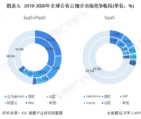 分析美国云计算行业发展现状,当前该国拥有全球领先的IT企业,如微软、IBM、谷歌、亚马逊以及甲骨文等,这些云服务企业占领了全球大部分云服务市场。从公有云细分市场来看,公有云IaaS+PaaS市场中,美国云计算企业亚马逊AWS、微软、谷歌、IBM份额合计占比近48%,SaaS市场中Salesforce、微软、谷歌、Oracle等代表性企业也均为美国企业。