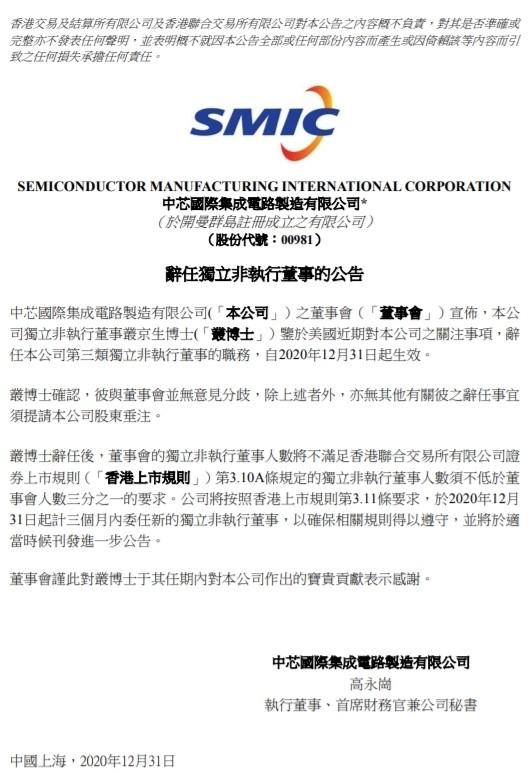 中芯国际发布公告称,公司独立非执行董事丛京生博士辞职,即日起生效。中芯国际表示,本公司独立非执行董事丛京生博士鉴于美国近期对本公司之关注事项,辞任本公司独立非执行董事的职务,自2020年12月31日起生效。