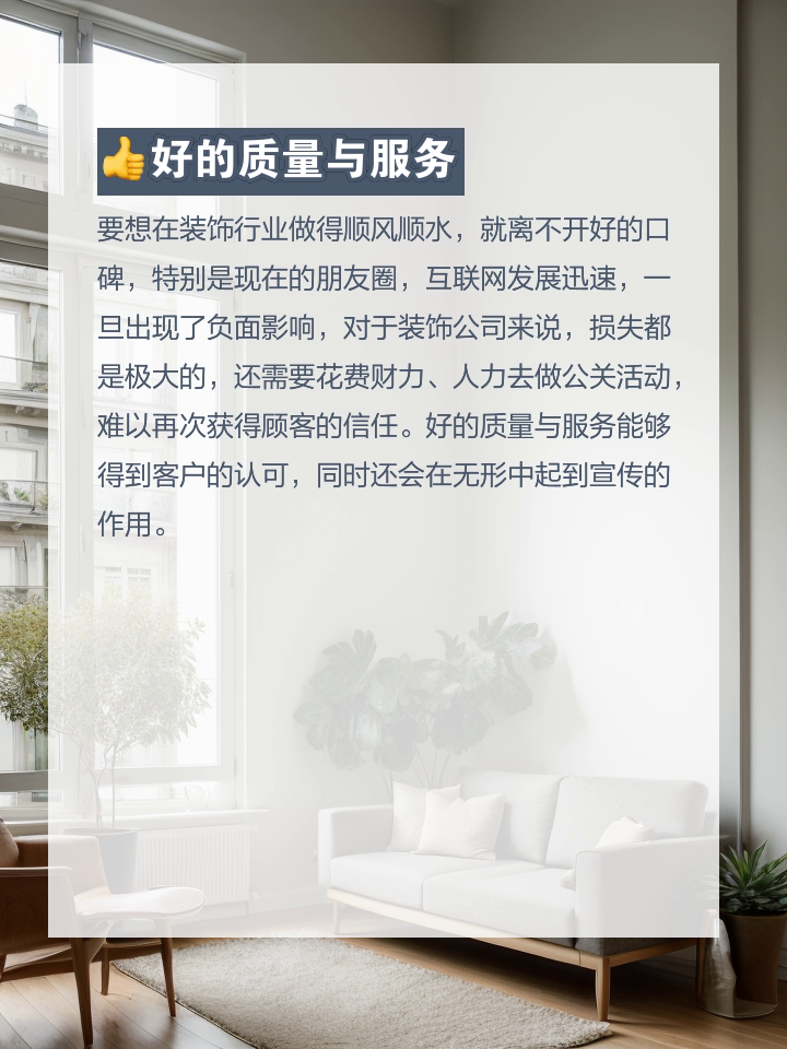 要想在装饰行业做得顺风顺水,就离不开好的口碑,特别是现在的朋友圈,互联网发展迅速,一旦出现了负面影响,对于装饰公司来说,损失都是极大的,还需要花费财力、人力去做公关活动,难以再次获得顾客的信任。好的质量与服务能够得到客户的认可,同时还会在无形中起到宣传的作用。