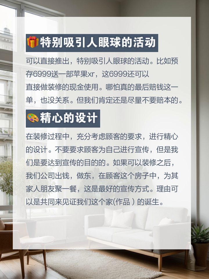 可以直接推出,特别吸引人眼球的活动。比如预存6999送一部苹果xr,这6999还可以直接做装修的现金使用。哪怕真的最后赔钱这一单,也没关系。但我们肯定还是尽量不要赔本的。