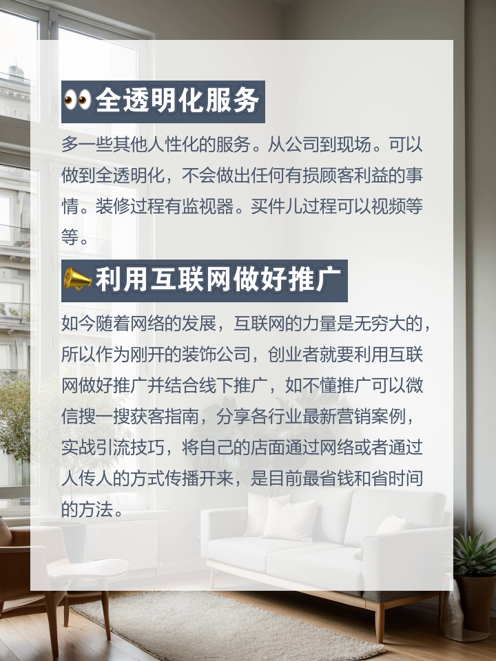如今随着网络的发展,互联网的力量是无穷大的,所以作为刚开的装饰公司,创业者就要利用互联网做好推广并结合线下推广,如不懂推广可以微信搜一搜获客指南,分享各行业最新营销案例,实战引流技巧,将自己的店面通过网络或者通过人传人的方式传播开来,是目前最省钱和省时间的方法。