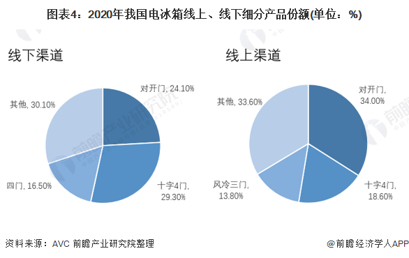 2020年,线下产品中十字4门、对开门、四门冰箱产品市占率排名前三,占比分别为29.3%、24.1%、16.5%;线上产品中对开门、十字4门、风冷三门产品市占率排名前三,占比分别为34%、18.6%、13.8%。