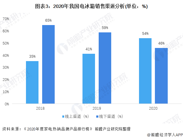 在国内冰箱市场整体量额齐跌的情况下,线上渠道销售占比较高。《2020年度家电热销品牌产品排行榜》披露,2018-2020年,冰箱线上渠道占比从35%上升至54%。2020年,线下渠道销售占比降低到46%。