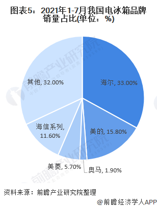目前,我国电冰箱行业生产企业较多,但市场中头部企业占据主要份额。虽然国内冰箱市场整体下滑的形势并未改变,但是主流品牌的市场份额却在逆市上扬。产业在线数据显示,2021年上半年,海尔、美的和海信的市场份额占比位居前三,分别为33%、15.8%和11.6%。