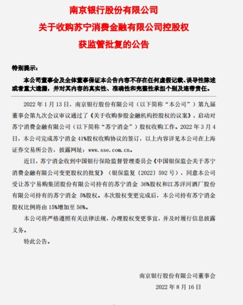 在8月16号的时候,大家通过相关的消息了解到南京银行发布了关于收购苏宁消费金融公司的信息,并且获得了监管批复的公告。这个公司也说,今日苏宁已经收到了银保监会的批复,并且股份有限公司将江苏洋河酒厂股份有限公司和苏宁销金5%的股权变更,当这次股权变更完成之后,南京银行在苏宁消金股权的比例会有所提升,由本来的15%已经增加到56%,在1月份的时候对苏宁消金的股权收购工作已经开始启动,在3月份的时候就完成了,相关的股权收购建立协议,能够达到41%的股权。