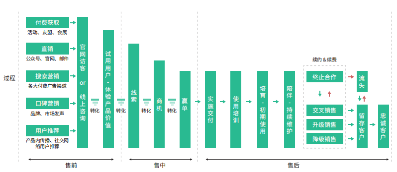 在整个企业服务的链路之中,围绕着客户全生命周期会产生许多与用户相关的数据,这些数据能及时反馈用户购买偏好,线索成熟度,产品使用体验,售后交付体验。在客户的全生命周期过程中,可以划分为售前、售中以及售后,如下图所示: