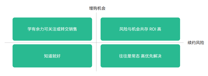 企业在进行客情分析时,通常采用问题导向和机会导向,寻找客户使用频次少的或突然使用频次高的问题,寻找能够吸引客户产生增购或交叉销售的关键行为等,按照“影响续约”和“促进增购 & 交叉销售”形成四象限 to do 列表。当高风险和高增购的事情得到解决,不仅能够续约,还有可能带来增购。