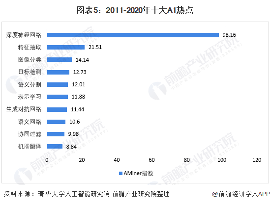 根据清华大学人工智能研究院、与中国工程院知识智能联合研究中心联合发布的《人工智能发展报告2011-2020》,2011-2020年十大AI研究热点分别为深度神经网络、特征抽取、图像分类、目标检测、语义分割、表示学习、生成对抗网络、语义网络、协同过滤和机器翻译。