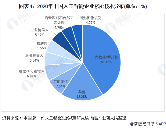 3、技术分布:中国人工智能企业核心布局的技术主要为大数据和云计算