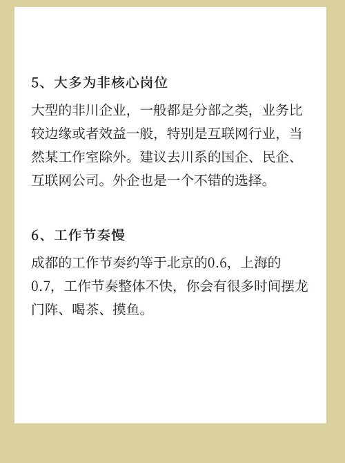 大型的非川企业,一般都是分部之类,业务比较边缘或者效益一般,特别是互联网行业,当然某工作室除外。建议去川系的国企、民企互联网公司,外企也是一个不错的选择。