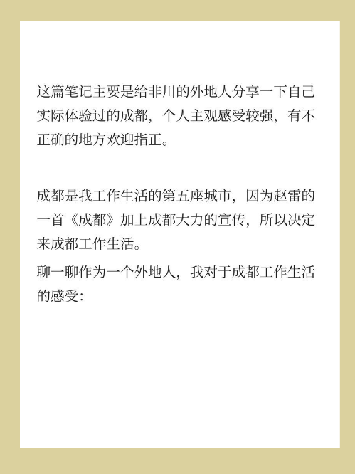 这篇笔记主要是给非川的外地人分享一下自己实际体验过的成都,个人主观感受较强,有不正确的地方欢迎指正。成都是我工作生活的第五座城市,因为赵雷的一首《成都》加上成都大力的宣传,所以决定来成都工作生活。