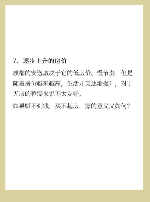 成都的安逸取决于它的低房价、慢节奏,但是随着房价越来越高,生活开支逐渐提升,对于无房的蓉漂来说不太友好。如果赚不到钱,买不起房,漂的意义又如何?