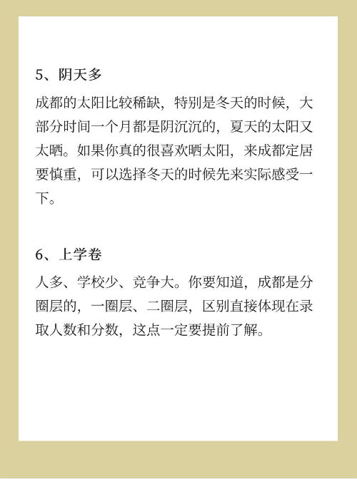 成都的太阳比较稀缺,特别是冬天的时候,大部分时间一个月都是阴沉沉的,夏天的太阳又太晒。如果你真的很喜欢晒太阳,来成都定居要慎重,可以选择冬天的时候先来实际感受一下。