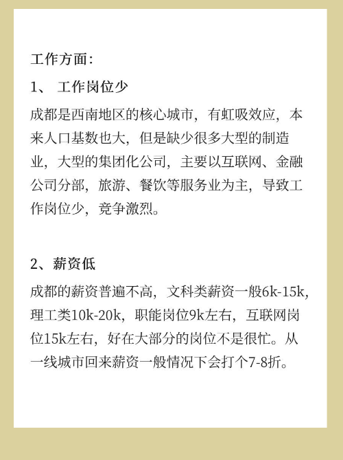 成都的薪资普遍不高,文科类薪资一般6k-15k理工类10k-20k,职能岗位9k左右,互联网岗位15k左右,好在大部分的岗位不是很忙。从一线城市回来,薪资一般情况下会打个7-8折。