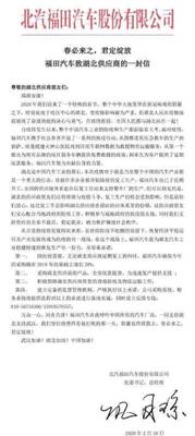 福田汽车的公开信中表示,第一,在疫情结束后,无论湖北供应商何时复工,福田汽车都将确保今年的采购额在2019年的基础上增长20%。第二,采购湖北供应商的产品,全部现款提货,为迅速复产提供支援。第三,积极保障湖北供应商供货的消毒防疫及物流运输工作。第四,建立完备的监督管理机制,严格执行以上承诺,财务系统也将按照承诺内容进行安排,同时设立反馈专线。