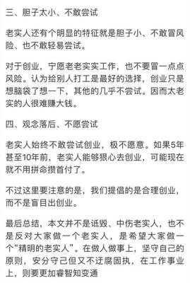 还有就是现在这个社会环境下,每一天每一个小时都在发生着剧烈的革新和变化,一个行业从兴起到衰落从过去的几百几十年缩短到现在的几年;个人积累财富和失去财富的时间都可以是几天而已。所以如果你裹足不前、畏惧新事物,保守不敢尝试,那么最新的创富方式总会从你身边溜走,让你总是成为那个临渊羡鱼的人,从这个角度上讲,老实人,实在是没什么优势。