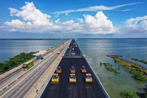 广西最长跨海特大桥贯通,合浦县和广东湛江市的交界处,穿过铁山港。桥的改扩建方案是在老桥的右侧再建一座新桥,当新桥的右侧完成后,将车辆改道,然后将老桥的上部和盖梁拆除重建为左侧桥。右边的新桥长4279米,左边的新桥长2898米。整座大桥从双向四车道升级为八车道,设计速度为每小时120公里。右边的新桥是广西已建成的最长跨海大桥。秦北改造项目作为交通运输部广西首个科技示范项目,在铁山港跨海大桥建设中,设立了泥浆处理站,引进“黑旋风”泥浆回收,采用先进合理的施工设备和工艺,最大限度地减少了项目建设对红树林生态系统的破坏。