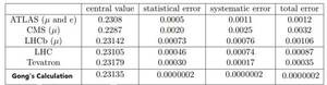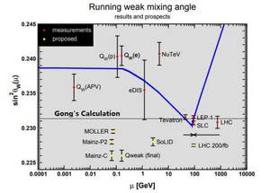 如最近( 2017年11月14日)欧洲核子中心大型(CERN)强子对撞机(LHC)的CMS项目刚刚报道了最新的弱电精密测量结果:{(sin(θ), lepton/eff)^2 = 0.23101±0.00052},参见https://arxiv.org/abs/1711.05288。温伯格角的精确测量值越来越接近龚学理论计算值28.75度。