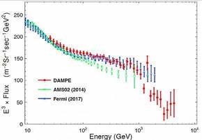 “悟空卫星工作530天得到的高精度宇宙射线电子能谱(红色数据点),以及和美国费米卫星测量结果(蓝点),丁肇中先生领导的阿尔法磁谱仪的测量结果(绿电)的比较。“ 悟空发现在1.2TeV附近有一个异常突出点!