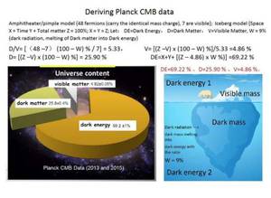 因此,可以求得暗能量DE=69.22 % 、暗物质D=25.90 % 、可见物质V=4.86 % 。以上模型精度取决于观测值W的精度,理论上可以实现任意位精度要求。以上模型可以看出什么是暗能量了,即宇宙时空就是暗能量,还加上暗物质转换成暗能量的那一部分。而普朗克CMB数据1直接观察到的事实是:暗能量= 69.2%;暗物质= 25.8%;与可见物质= 4.82%,与D / V = 5.35。比较一下,可以看出GM所推出的结果与之非常接近,甚至GM更精确。