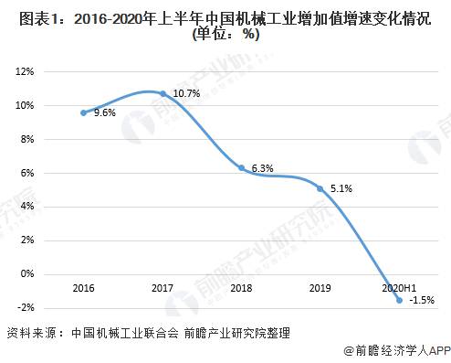 近年来,我国机械工业增加值增速有所放缓,根据中国机械工业联合会公布的数据显示,2016-2020年上半年,中国机械工业增加值增速整体呈下降趋势,2019年为5.1%,低于同期全国工业平均水平(5.7%),也低于上年机械工业6.3%的增速。2020年上半年,受新冠肺炎疫情影响,我国机械工业增加值增速同比下降1.5%。