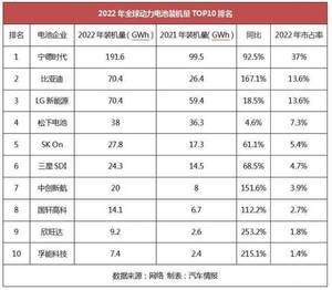 据韩国SNE Research统计,2022年全球电动汽车动力电池装机量约为517.9GWh,同比增长71.8%。下方这张表格,则是按照装机量多少进行的排名,从第一名到第十名分别是宁德时代、比亚迪、LG新能源、松下电池、SK On、三星SDI、中创新航、国轩高科、欣旺达、孚能科技。
