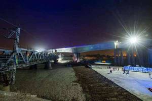 2021年5月8日零点五十分,在京广铁路上,两座万吨T型桥墩同时开始在空中逆时针转体,49分钟后,两座桥墩完成合体,桥墩转动的角度为33度,场面壮观。丰台站位于中国北京市丰台区,是北京铁路枢纽的重要车站,并且是国内首座普速、高速列车双层车场站型布置的大型现代化铁路站房。此次的桥墩合体采用“先建后转”工艺技术,是为了最大程度减少对列车运行的影响。铁路部门对桥体进行了精确的测量,找出准确的位置,保证万无一失,才完成这次完美的合体,也证明了中国建设铁路的技术强大。建成后的丰台站会与北京多个铁路枢纽相互作用起来,更加方便市民出行。