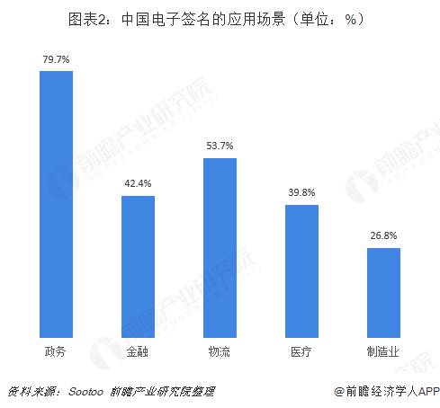 根据Sootoo调查数据显示,目前电子签名的主要应用场景包括政务、金融、物流、医疗、制造业,其中政务应用比例最大,约为79.7%;其次是物流,约为53.7%。
