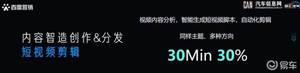针对复杂性更高的短视频剪辑方面,基于百度强大的AI能力,可将视频素材通过视频内容分析、智能生成短视频脚本、短视频素材剪辑几个过程,生成多条同样主题方向不同脚本的短视频,只需要30分钟,同样过程中没有人工参与,视频生成成本只有人工剪辑成本的30%。