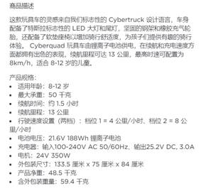 在参数规格上,特斯拉Cyberquad最大承重50kg,适用于8-12岁儿童,驱动电机拥有350W功率,最快时速8km/h。搭配容量为188Wh的锂离子电池,产品重量48.5kg。