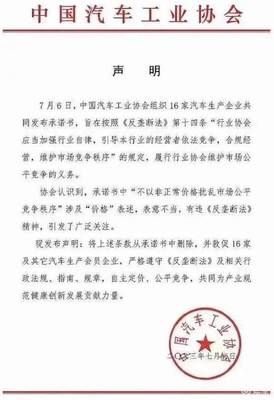 不过,就在这份承诺书签署仅仅两天后,中国汽车工业协会就发表声明称,《承诺书》中的“不以非正常价格扰乱市场公平竞争秩序”有违《反垄断法》精神,将会把上述条款从承诺书中删除。