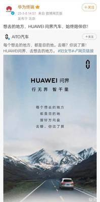 3月8日,AITO汽车在其微博/公众号平台发布节日海报,正式打出「HUAWEI问界」的全新标语——而不是此前的「高端品牌」AITO。