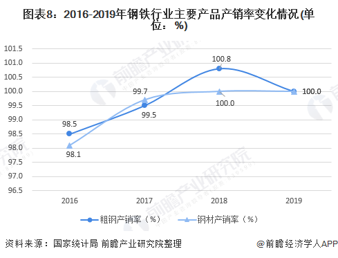 根据国家统计局数据,2016-2019年主要钢铁产品的产销率呈上升趋势,2019年中国粗钢和钢材的产销率均为100%。这主要是由于各地不断推进去产能和产能置换的进程,钢铁行业供给侧改革成效逐渐显现所致。